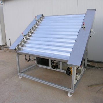 - 25 L-CPC (Figure 2b): it consists of two CPC type independent plants set up on a 37º inclined platform. Each prototype has 5 borosilicate glass tubes connected in series (50 mm external diameter), with a 1 m2 illuminated surface, 25 L total volume (11.25 L illuminated volume). One of them with a configuration that allows to work in flow or static conditions as well as allow to adapt it at different water volumes.