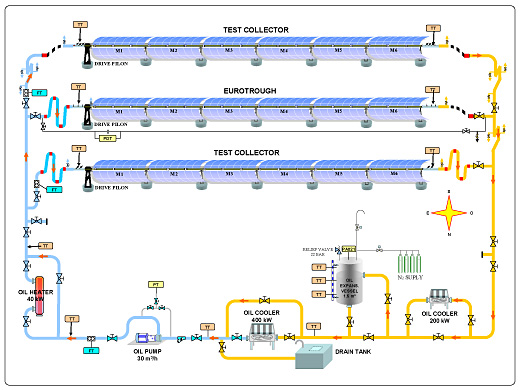 The facility consists of a closed thermal-oil circuit connected to several solar collectors of 75-m long connected in parallel (up to three collectors can be installed in parallel), being able to operate only one at a time. The east-west rotating axis of the solar collectors increases the number of hours per year in which the angle of incidence of the solar radiation is less than 5º. The thermal oil used in this facility (Syltherm 800) has a maximum working temperature of 420ºC and a freezing point of -40ºC.