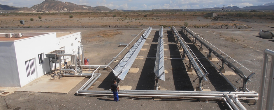 The purpose of this facility is the preliminary study of the behaviour of a parabolic trough solar field of small concentration ratio, the determination of its feasibility as a heat source in polygeneration schemes, in particular in CSP+D requiring temperatures around 200°C. The collector selected was the Polytrough 1200 prototype by NEP Solar. It has a production of 15.8 kW per module (0.55 kW/m²) under nominal conditions, with a mean collector temperature of 200°C, and efficiency over 55% in the range of 120-220°C (for 1000 W/m² of direct normal irradiance).