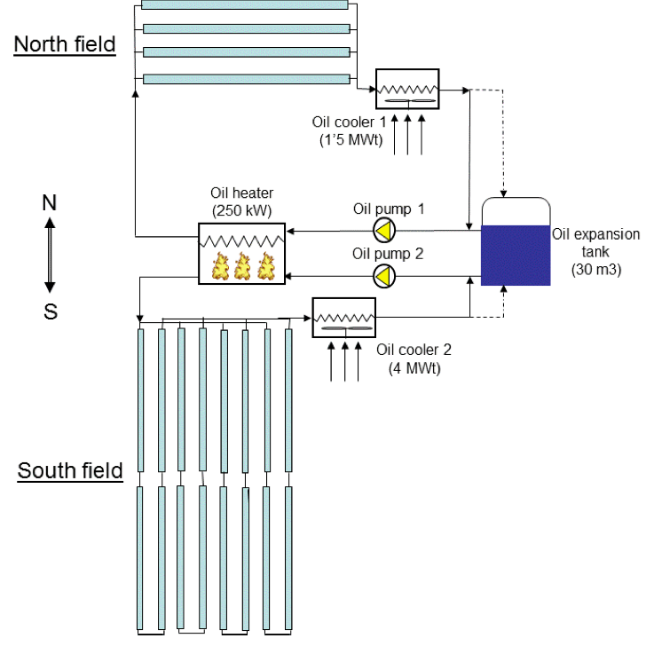 Each field is provided with a complete oil circuit installed on a 30mx30m concrete platform between the two fields, and both circuits share: an oil expansion tank with a capacity of 30 m3, a gas-fired oil heater with a thermal power of 250 kW, a meteorological station equipped with solar radiation, ambient temperature and wind sensors, and the data acquisition system (DAS). Additionally to these common elements, the oil circuit associated to the North and South fields are composed of:
