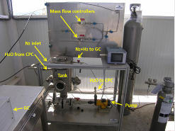 Hydrogen generation plant (Figure 1a): it consists of a 10 L maximum volume stainless steel tank, equipped with entry and exit for gas and water and a sampling point. Two flow mass controllers are used to control the N2 gas flow in the top of the reactor during the filling phase. The N2 is used as a carrier gas for the H2 generated during the reaction and that is later measured online in a GC-MS.
