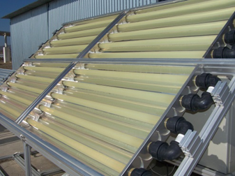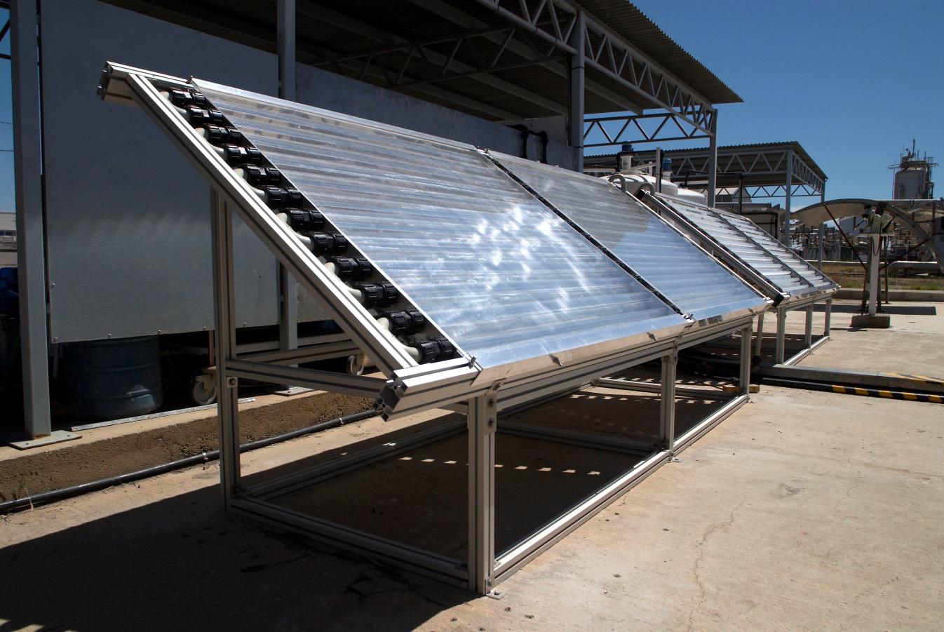 Several CPC pilot plants have been installed at PSA facilities built by modules that can be connected in series. Each module consists of several photoreactors (borosilicate glass tubes) placed in the focal point of an anodized aluminium mirror with a Compound Parabolic Collector (CPC) shape and placed on a platform titled 37° from the horizontal to maximize the global solar collection of photons through the year in the PSA location.