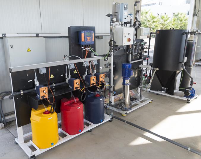 To treat industrial wastewater, a full treatment train is established, which usually consists of a pre-treatment step, an advanced oxidation treatment to enhance the biodegradability of the complex water matrix, a subsequent biological treatment and finally a tertiary treatment that allows its agricultural water reuse. For this aim, the facilities also count with: