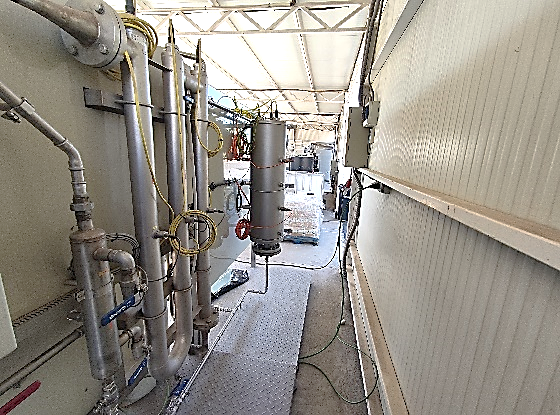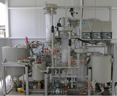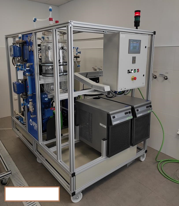 - Membrane distillation plant (Figure 5b) consists of a membrane distillation module integrated into a system consisting of two hydraulically separated loops, one for the hot solution and the other for the cooling solution and a 150L feeding tank (Qmax = 1.1 m3/h, T = 80°C). The control of the plant is automatized being the variables registered and allowing to work during 48h. The materials of the plant support its work in a wide pH range being also equipped with a pH regulation system. The system also has the option of using a 25L jacketed borosilicate crystallizer for recovery of the value-added compounds from the rejected stream.