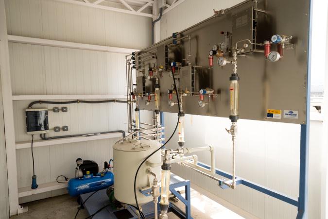 - Ozone plant (Figure 4c), consists of two different systems: a conventional contact column reactor (up to 580 L, titanium ozone diffusers) and a pressurized system with a total volume of 110 L that allows working in a nanobubble mode (high-pressure pump) and in a microbubbles mode by Venturi injection of ozone directly in the recirculation system of the tank or in a little intermediate tank (ca. 2.5 L). This reactor is equipped with an oxygen generator (Anseros SEP100), a flowmeter for inlet air regulation, an ozone generator (corona-discharge, Anseros COM-AD02, 44 g O3/Nm3 for a gas flow of 0.2 Nm3/h), two non-dispersive UV analysers (BMT 964) to measure inlet and outlet ozone concentration in the gas phase, a dissolved ozone sensor, a system for humidity elimination in the gas phase (outlet) a thermo-catalytic residual ozone destructor. This ozonization system works in a batch mode allowing its combination with other technologies such as CPC photoreactors, photocatalysis and the UV pilot plant.