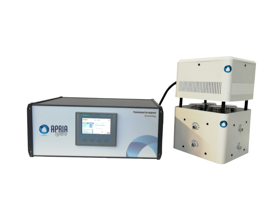 - A UV-LED lab system (Figure 3b) Photolab LED, APRIA Systems S.L.) consisting of a collimation system provided with 4 LED lamps at the different regions of the irradiation spectrum (UV-C (λmax = 275 nm), UV-B (λmax = 300 nm), UV-A (λmax = 370 nm) and VIS (λmax = 450 nm) to perform photochemical and photo-catalytic lab-scale experiments studying the influence of the irradiation region. The reactor allows to perform water treatment experiments in Petri dishes containers (Ø= 5 cm, V ≈ 35 mL), is controlled by a console that allows the regulation of each LED by independent control systems (on/off and total radiated power selection) that allows to simultaneously working with the 4 LEDs installed (in different containers) and to control and monitor both, the temperature and the power consumption.