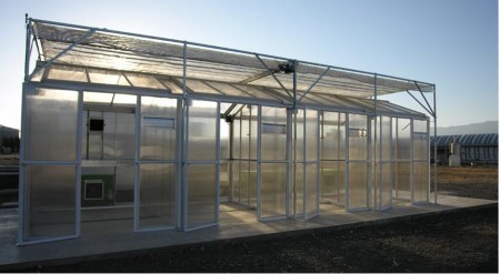 - Experimental greenhouse (Figure 6c) of 30 m2, made of 10 mm polycarbonate thick with a shoulder height of 2.5 m and a roof slope of 40%. The chamber is divided into 4 independent and equal rooms (3 m2 x 2.5 m2). Each area is equipped with independent and automatized systems that control temperature, humidity, irrigation (automatic drip irrigation) and aeration (the roof slope of each area acts as windows) by using the Ambitrol® software. Moreover, the crop camera is equipped with a global solar radiometer for measuring the incident solar radiation connected to a cover on the top of each room which can be automatically folded and re-fold to reduce the incidence of irradiance.