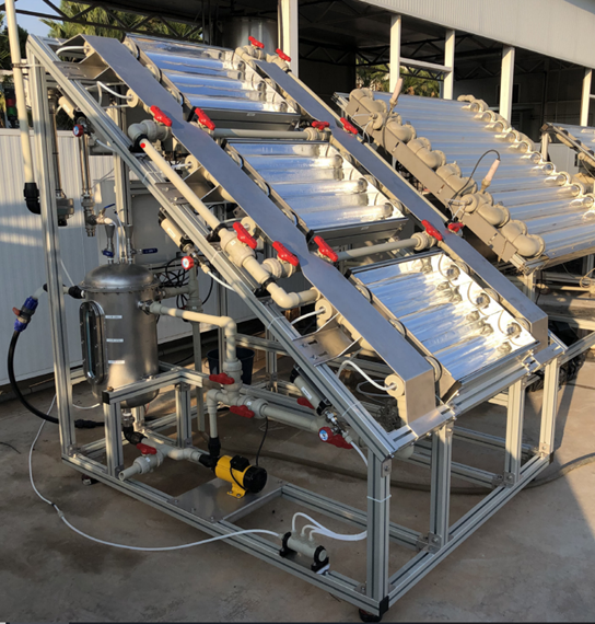 - ELECTROX-CPC: (Figure 1e) A 2 m2 CPC collector with 10 borosilicate glass tubes (50 mm diameter), an illuminated volume of 25 L and a total volume of 40 L is connected to four electro-cells for experimental research on electro-photo-Fenton processes for decontamination and disinfection of water.