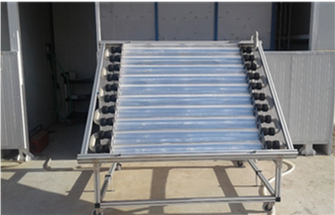 - NOVO75 photo reactor prototype (Figure 1c): solar reactor prototype with a different mirror set-up that allows increasing the illuminated water volume. It consists of twelve 75 mm diameter borosilicate glass tubes connected in series, with a 2 m2 illuminated surface, 74 L total volume with 68.5 L illuminated volume. It is equipped with Tª, DO and pH sounding lines, as well as a Tª control system and oxygen boost in water. Currently, this prototype has been modified in order to fit in an ozonization experimental plant.