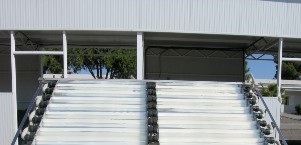 - CPC CADOX photo reactor prototype (Figure 1b): it consists of four CPC units (50 mm tube diameter) with a total gathering surface of 4 m2 and a water treatment volume of 75 L of which 45 L are illuminated. This prototype has been designed and built to connect it to an ozonization system (50 L) and treatment through biological oxidation. It also has a pH, Tª, DO, H2O2, O3 and water Tª control and reactive dosage monitoring system. Besides, and connected to this photo-reactor, there is a biological water treatment system consisting of three tanks: a 165 L conical tank for wastewater conditioning, a 100 L conical recirculation tank and a 170 L flat-bottom fixed-bed aerobic biological reactor (filled with 90-95 L of Pall®Ring polypropylene supports to be colonized by active sludge).
